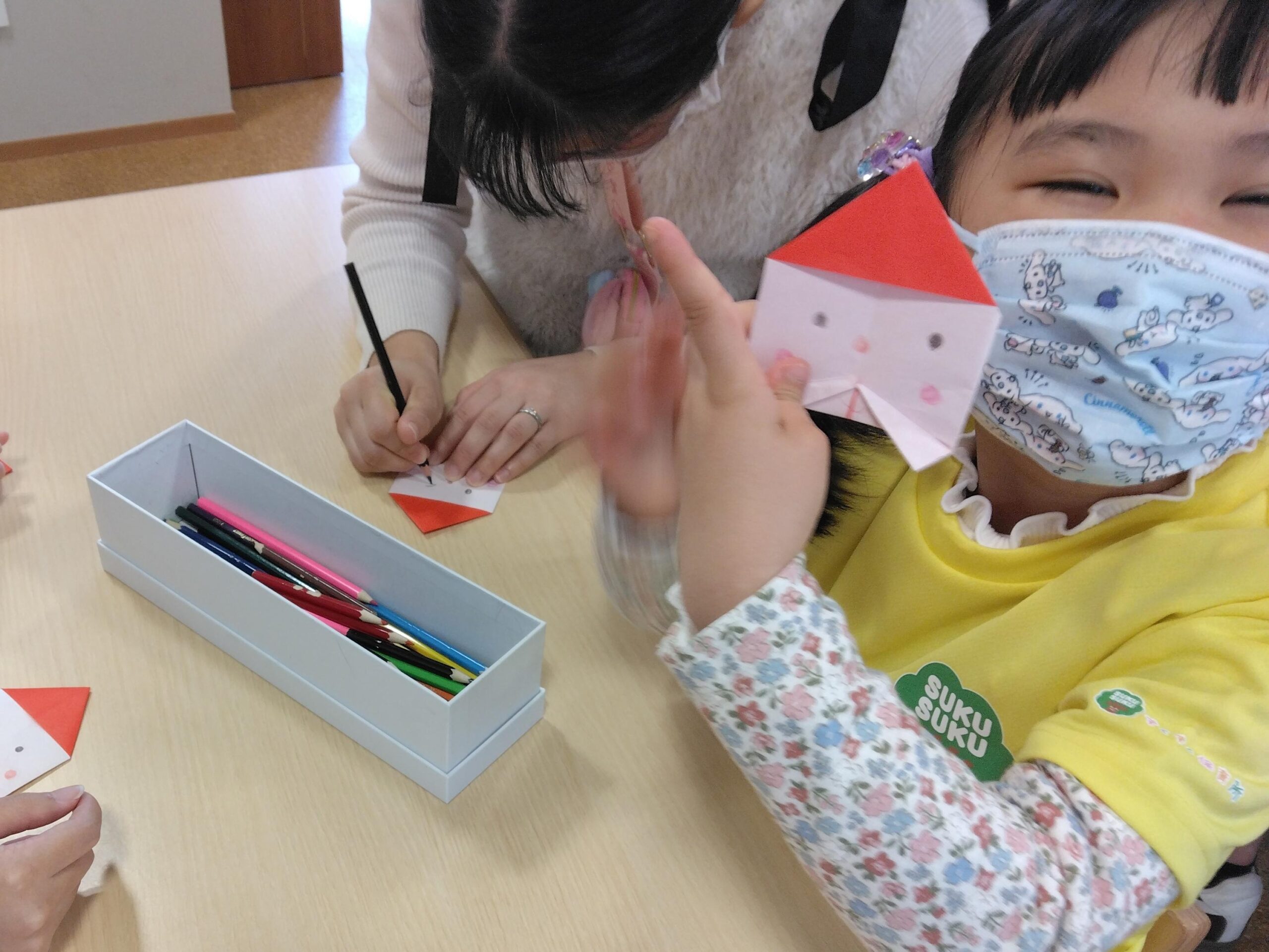 4歳児クラスは、親子で折り紙を使ってサンタクロースを作りました。