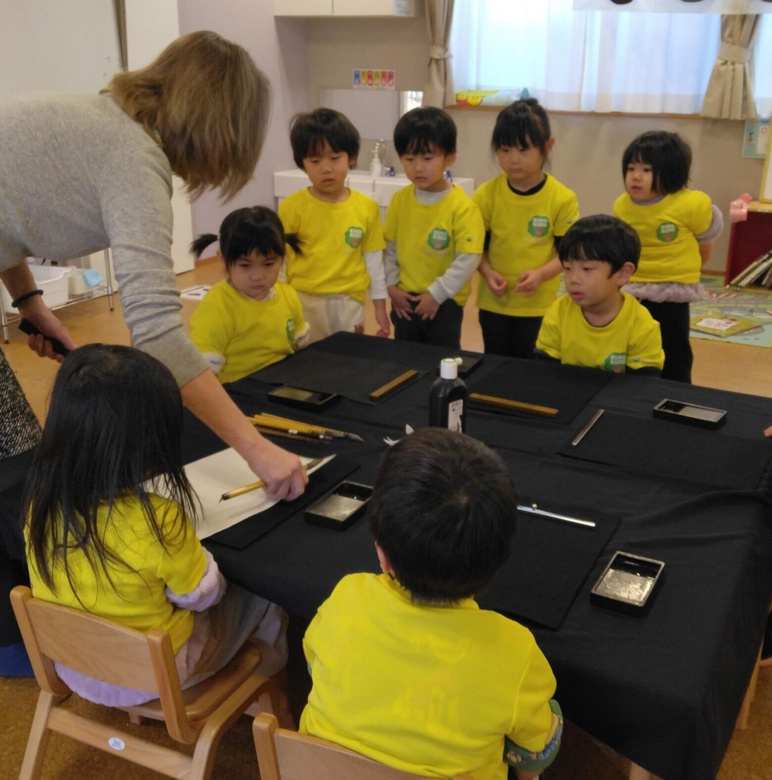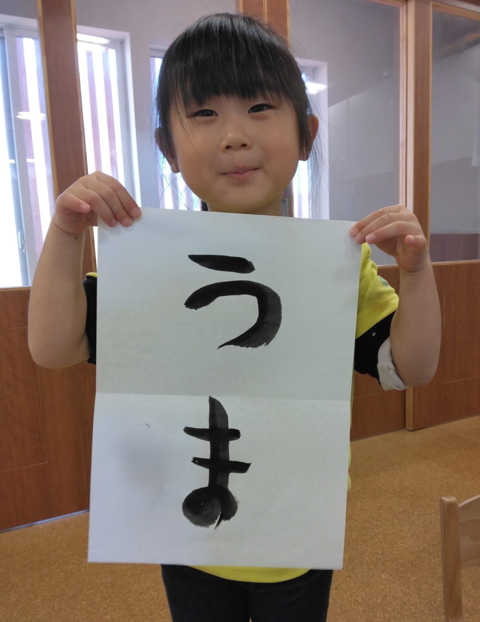 文字を書くのは難しすぎるかな..と思っていたのですが、筆の持ち方や書き順を教えてもらいながら自分なりに書くことが出来ていて驚きました!!